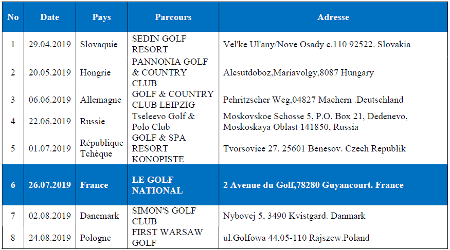 « 3ème Open international de France » est une des compétitions officielles de l’EVGA Tour 2019 (Européen Vietnamien Golf Association), organisé dans 8 pays: Slovaquie, Hongrie, Allemagne, Russie, République Tchèque, France, Danemark et Pologne. La finale sera organisée en Turquie.