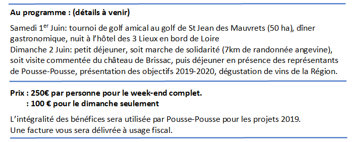 Dimanche 2 Juin: petit déjeuner, soit marche de solidarité (7km de randonnée angevine), soit visite commentée du château de Brissac, puis déjeuner en présence des représentants de Pousse-Pousse, présentation des objectifs 2019-2020, dégustation de vins de la Région.